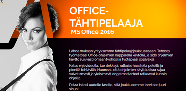 Pelaa itsesi viiden tähden osaajaksi Office-ohjelmissa! Lyhyistä ohjevideoista opit nopeasti paljon uuttaa. Voit myös testata osaamistasi ja samalla opit lisää. Saat paljon hyviä vinkkejä ja pelien avulla ratkot yleisiä ongelmatilanteita.